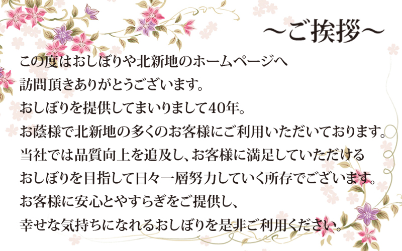 | 基本料金 | おしぼりの種類、本数などのご契約プランにより1本の単価が異なります。 お気軽にお問い合わせください。 |